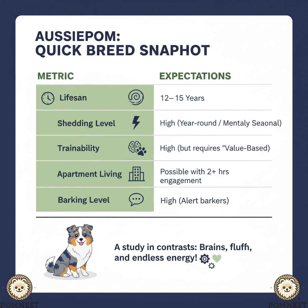 No. While they share the Australian Shepherd’s intelligence, the Pomeranian influence adds a layer of “Spitz” independence. Unlike a pure Mini Aussie, which lives to serve its owner, an Aussiepom often asks, “What’s in it for me?” before following a command.
